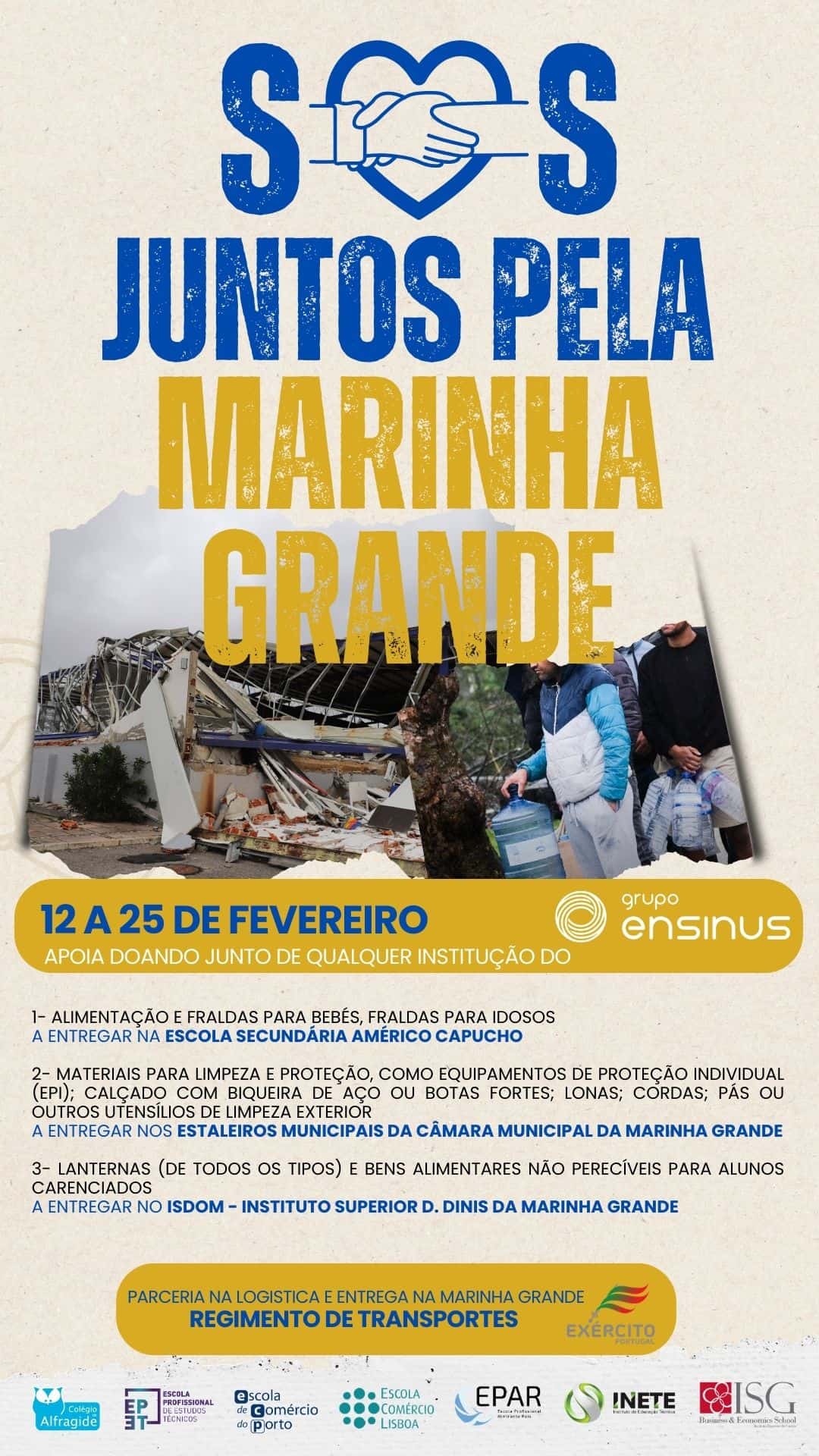 Na sequência dos intensos eventos climáticos que têm afetado o país, a cidade de Marinha Grande e a região de Leiria foram profundamente impactadas, pelo que todas as Instituições de Ensino do Grupo Ensinus decidiram reunir-se neste esforço para apoiar quem mais precisa e tentar proporcionar estabilidade num momento de grande incerteza e necessidade.